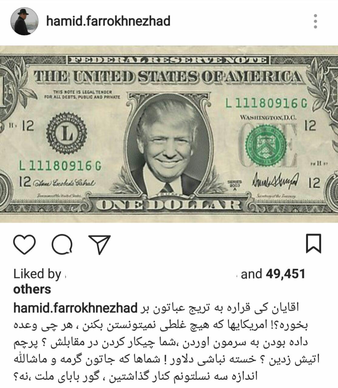 به گزارش سایت روزنو، حمید فرخ نژاد در صفحه اجتماعی خود پستی منتشر کرد که از مسئولین به دلیل افزایش نرخ ارز ها و بخصوص دلار، بشدت انتقاد کرده است. این هنرمند پرسیده آتش زدن پرچم آمرکا چه سودی به حال مردم کشورمان داشته است ؟