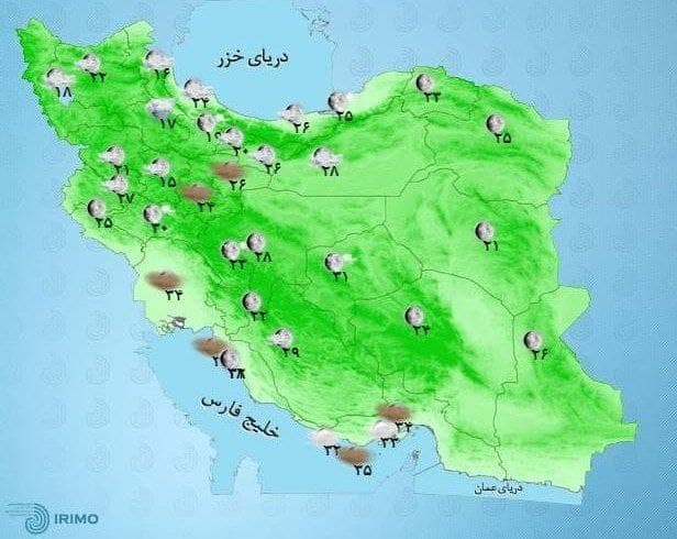 صادق ضیاییان ضمن بیان اینکه امروز (۱۲ مرداد) در برخی نقاط استانهای آذربایجان غربی، آذربایجان شرقی، اردبیل، کردستان، کرمانشاه، همدان، مرکزی، لرستان، قزوین، اصفهان، یزد، قم، البرز، تهران، شمال سمنان، گیلان، مازندران، غرب گلستان، جنوب سیستان و بلوچستان، جنوب و غرب کرمان، شمال و شرق فارس، شرق کهگیلویه و بویراحمد و ارتفاعات چهارمحال و بختیاری بهویژه در ساعات بعدازظهر و اوایل شب رگبار و رعدوبرق و وزش باد شدید موقت رخ میدهد، گفت: این شرایط در مناطق مستعد با احتمال گرد و خاک پیشبینی میشود.