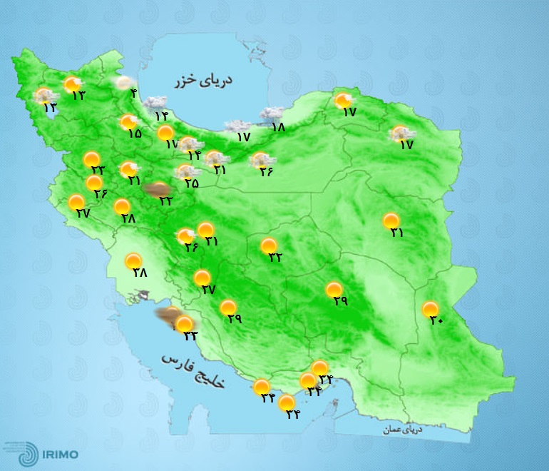 صادق ضیاییان با اشاره به نقشه‌های ‌پیش‌یابی هواشناسی، گفت: پنجشنبه (۱۵مهر) در شمال آذربایجان غربی و آذربایجان شرقی، اردبیل، گیلان، مازندران، گلستان، خراسان شمالی، شمال خراسان رضوی و ارتفاعات البرز در استان‌های سمنان، تهران، البرز و قزوین ابرناکی، بارش باران، وزش باد و کاهش نسبی دما ادامه خواهد داشت و دریای خزر مواج است.