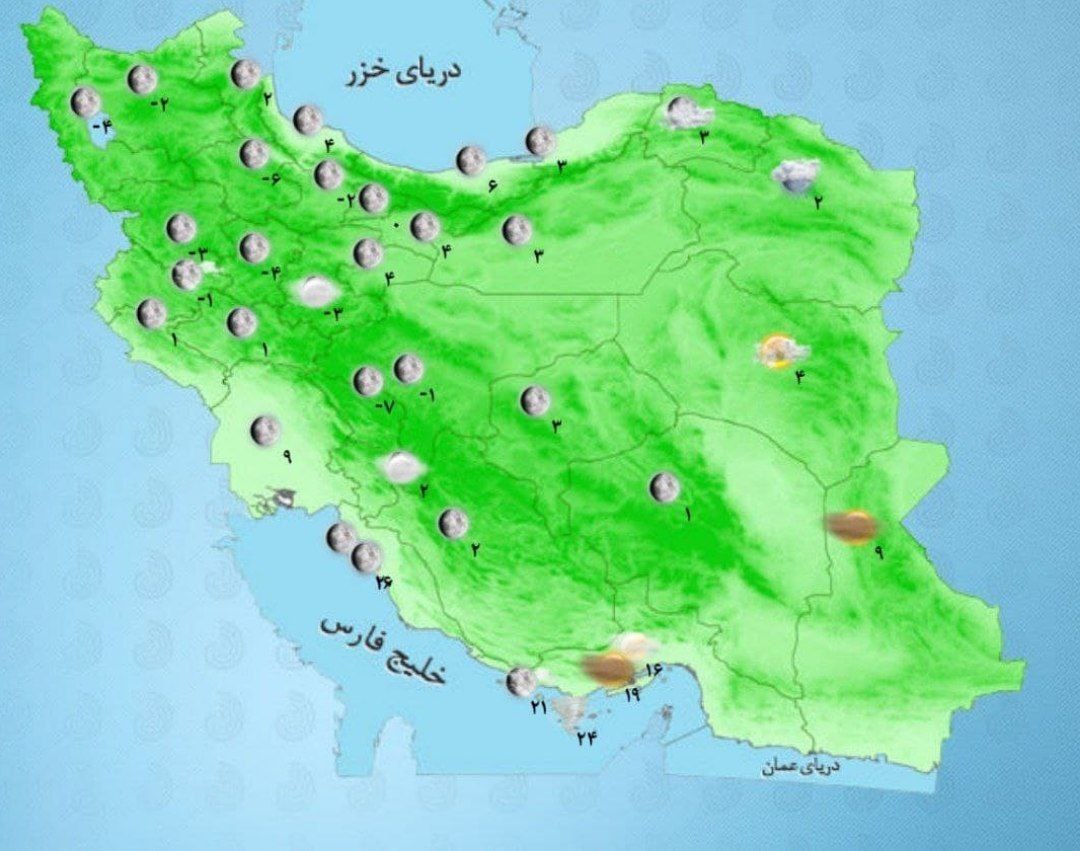 روز نو :براساس تحلیل آخرین نقشه‌های پیش یابی طی ۲۴ ساعت آینده در خراسان رضوی بارش پراکنده و در برخی از نقاط هرمزگان و ارتفاعات جنوب کرمان رگبار رعد و برق و وزش باد شدید موقت پیش بینی می‌شود، در سایر مناطق کشور جوی آرام و پایدار استقرار خواهد داشت. در شهر‌های صنعتی و پرجمعیت غلظت آلاینده‌های جوی افزایش می‌یابد.