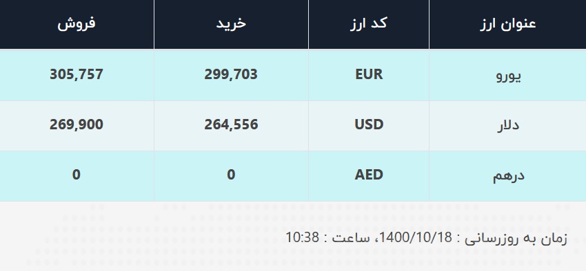 قیمت فروش یورو نیز در صرافی‌های بانک‌ها، ۳۰۵۷۵۷ ریال و نرخ خرید آن ۲۹۹۷۰۳ ریال اعلام شده است.