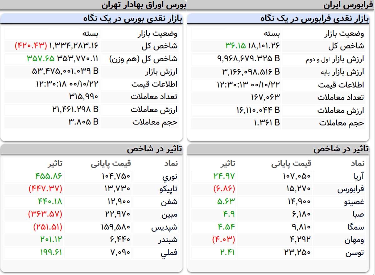 در پایان معاملات امروز بازار سرمایه، شاخص کل با کاهش ۴۲۰ واحدی به عدد یک میلیون و ۳۳۴ هزار واحد و شاخص هم وزن با افزایش ۳۵۷ واحدی به عدد ۳۵۳ هزار واحد رسید.