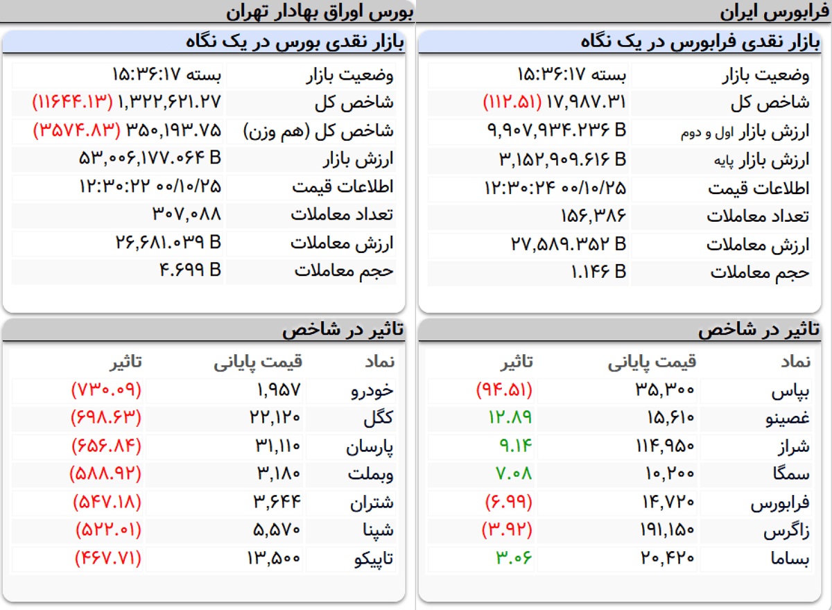 همچنین در فرابورس نیز شاخص با کاهش ۱۱۲ واحدی به عدد ۱۷ هزار واحد رسید و نماد‌های بپاس، فرابورس و زاگرس بیشترین تاثیر را در کاهش شاخص کل داشتند.