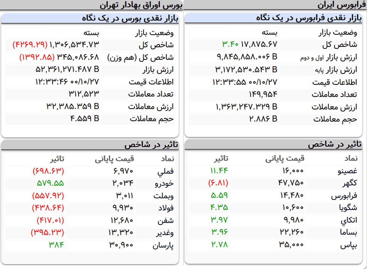 همچنین در فرابورس نیز شاخص با افزایش ۳ واحدی به عدد ۱۷ هزار واحد رسید و نماد‌های غصینو، فرابورس و شگویا بیشترین تاثیر را در کاهش شاخص کل داشتند.
