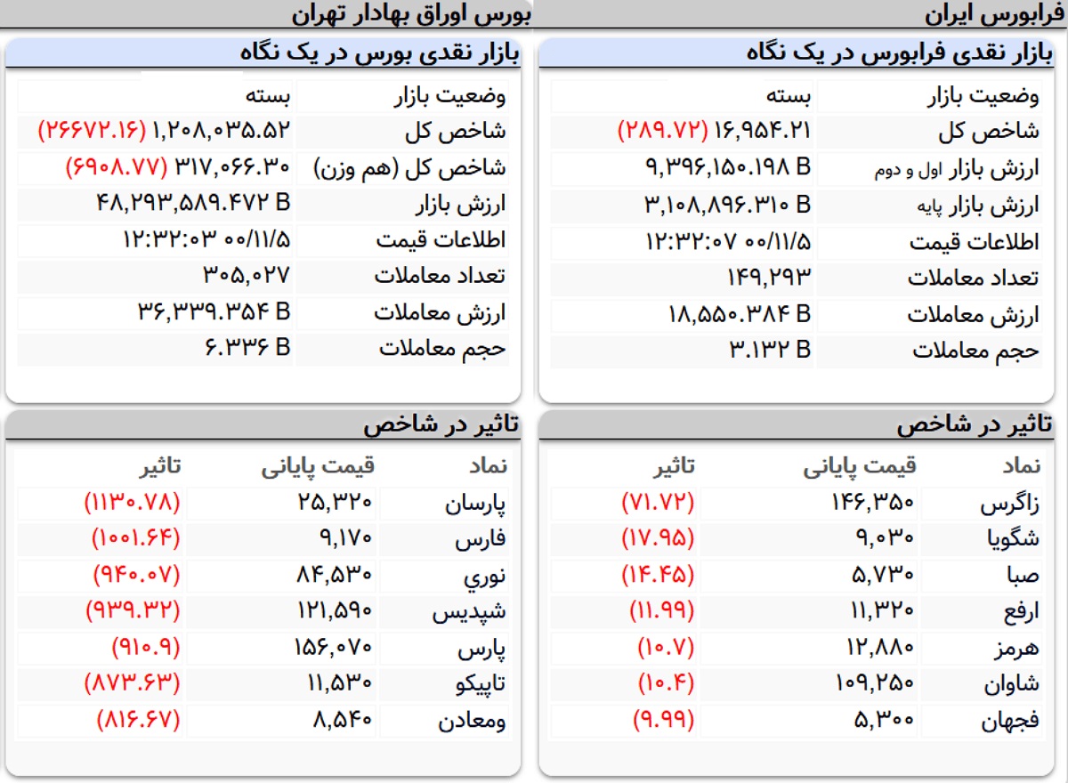 امروز شاخص فرابورس بیش از ۲۸۹ واحد کاهش داشت و بر روی کانال ۱۶ هزار و ۹۵۴ واحد ثابت ماند.