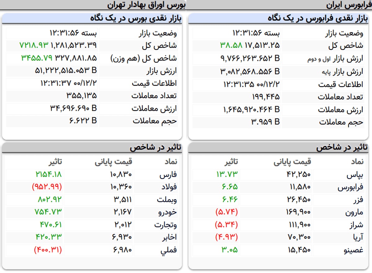 نماد‌های فارس، وبملت، خودرو و وتجارت بیشترین تاثیر مثبت را بر شاخص دارند و نماد‌های فولاد و فملی با افت ارزش مانع رشد بیشتر شاخص شدند.