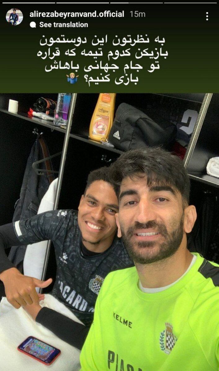 علیرضا بیرانوند با انتشار عکسی از خودش به همراه یکی از هم تیمی‌هایش در صفحه اینستاگرام، از دنبال کنندگان خود خواست تا حدس بزنند هم تیمی او عضو کدام یک از تیم های هم گروه ایران در جام جهانی قطر است.