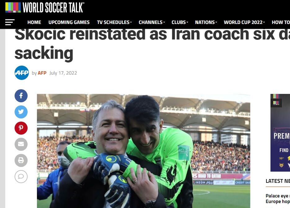 در همین رابطه سایت «وردساکر» انگلیس در گزارشی از بازگشت اسکوچیچ بعد از ۶ روز از برکناری اش تعجب کرد و نوشت: اسکوچیچ شش روز پس از اخراج به عنوان سرمربی تیم ملی ایران بازگشت!