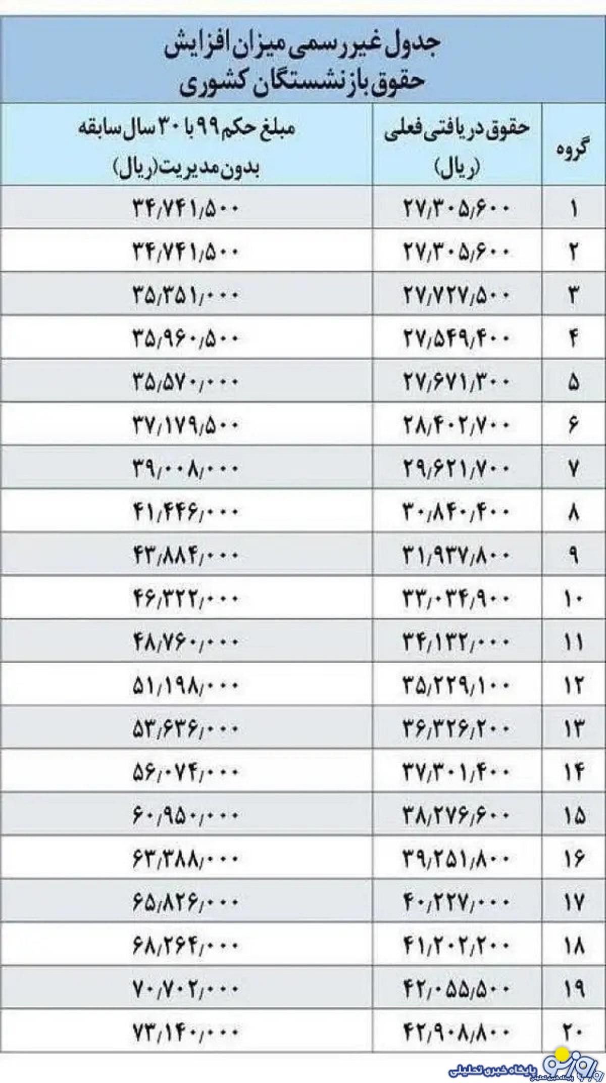 طبق جدول منتشر شده حقوق بازنشستگان کشوری حدود ۳۰ تا ۷۰ درصد افزایش پیدا میکند.