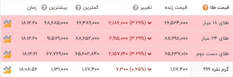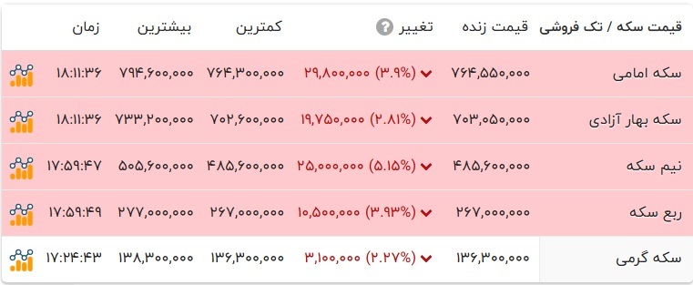 در بازار نرخ هر گرم طلای ۱۸ عیار با ۲۱۸ هزار تومان کاهش و با نرخ ۶ میلیون و ۶۵۲ هزار تومان در بازار طلا معامله شد. سکه امامی با ۲ میلیون و ۹۸۰ هزار تومان کاهش به ۷۶ میلیون و ۴۵۵ هزار تومان قیمت گذاری شد. سکه بهار آزادی با ۱ میلیون و ۹۷۵ هزار تومان کاهش به ۷۰ میلیون و ۳۰۵ هزار تومان رسید. نرخ نیم سکه و ربع سکه به ترتیب ۴۸ میلیون و ۵۶۰ هزار تومان و ۲۶ میلیون و ۷۰۰ هزار تومان در تابلو اعلان قیمت‌ها نمایان شد.