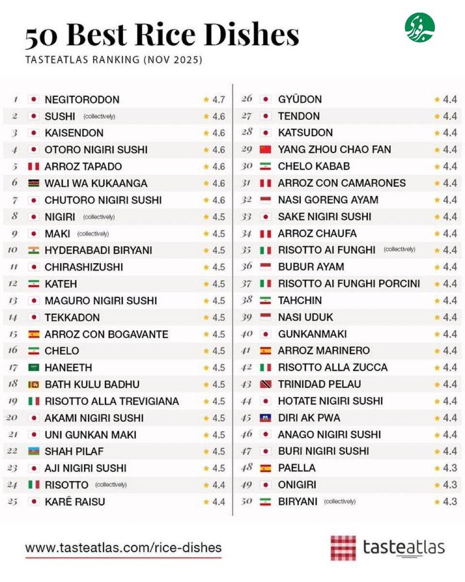 روزنو :«کته»، «چلو»، «چلوکباب» و «ته‌چین» به‌‌ترتیب در جایگاه‌های دوازده، شانزده، سی و سی‌و‌هشتم بهترین غذاهای برنجی جهان در وب‌سایت TasteAtlas قرار گرفتند.
